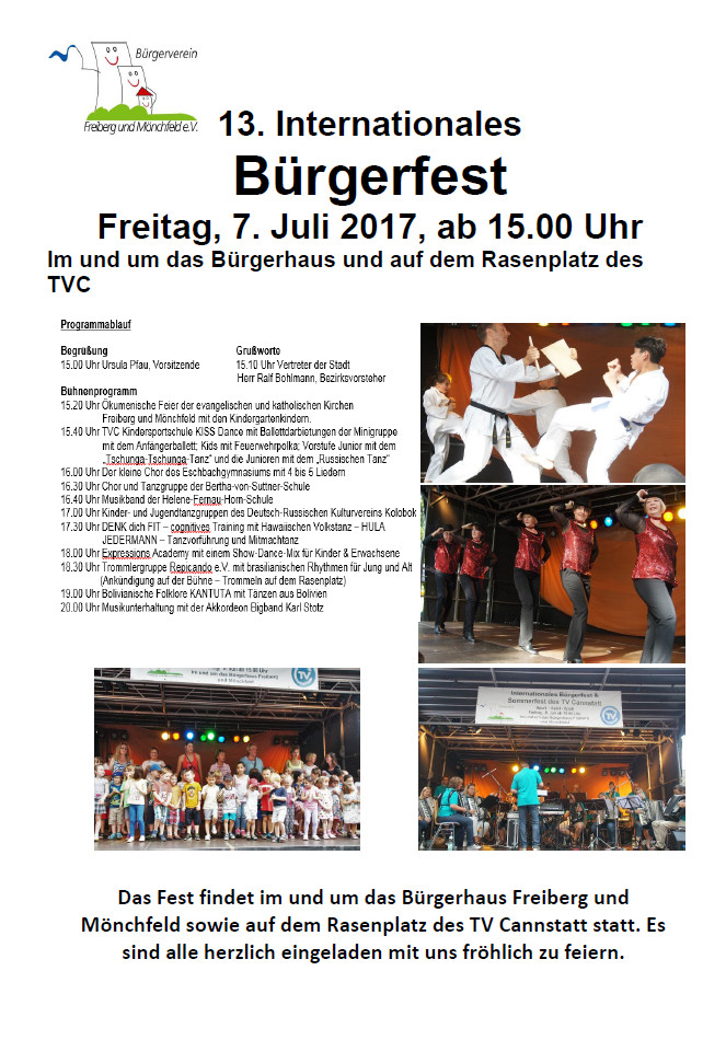 Am Freitag 07. Juli findet ab 15.00 Uhr das 13. Internationale Bürgerfest auf unserem Sportpark Freiberg-Mönchfeld statt.