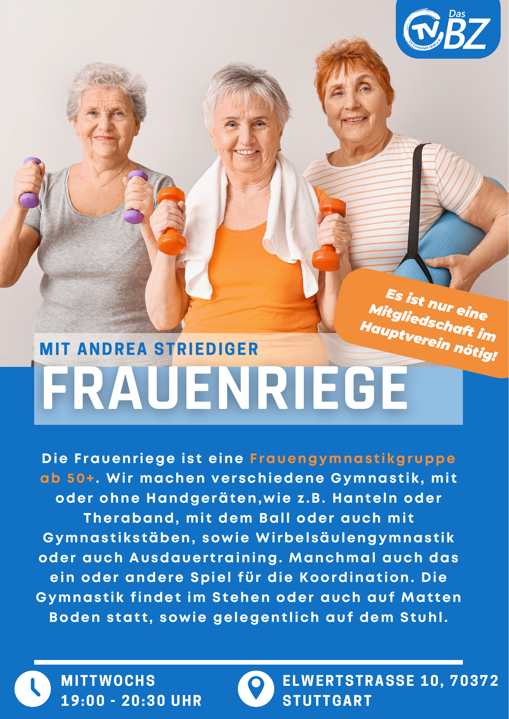 Ein vielseitiges Gymnastikangebot mit und ohne Geräte, kombiniert mit Wirbelsäulengymnastik, Koordinationstraining und gelegentlichen Bewegungsspielen – speziell für Frauen ab 50.