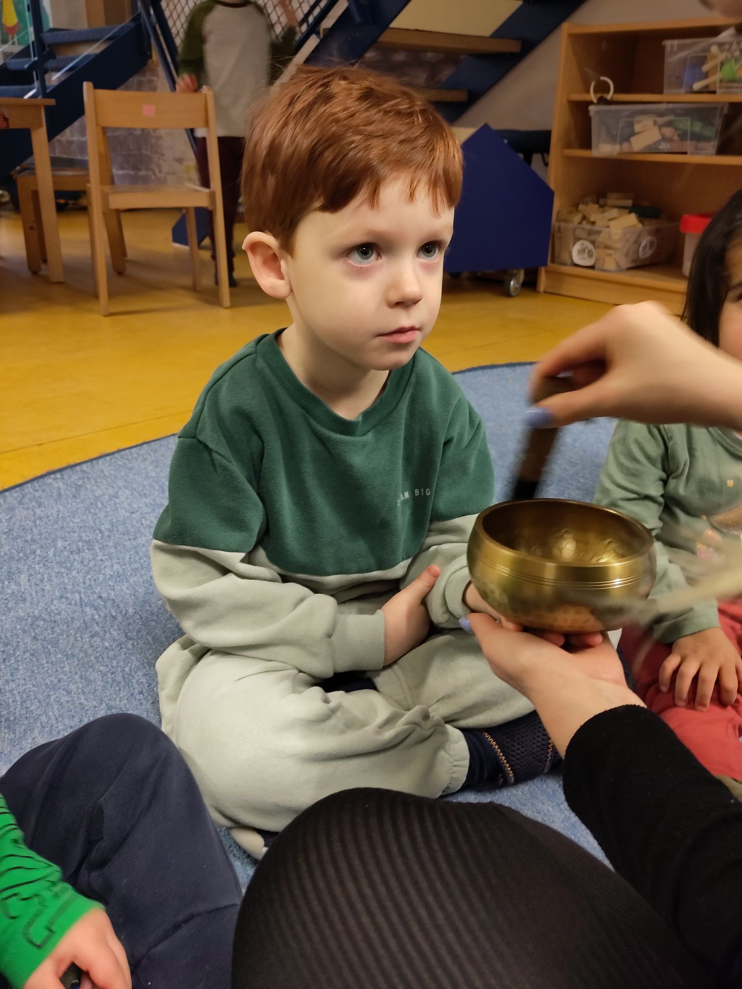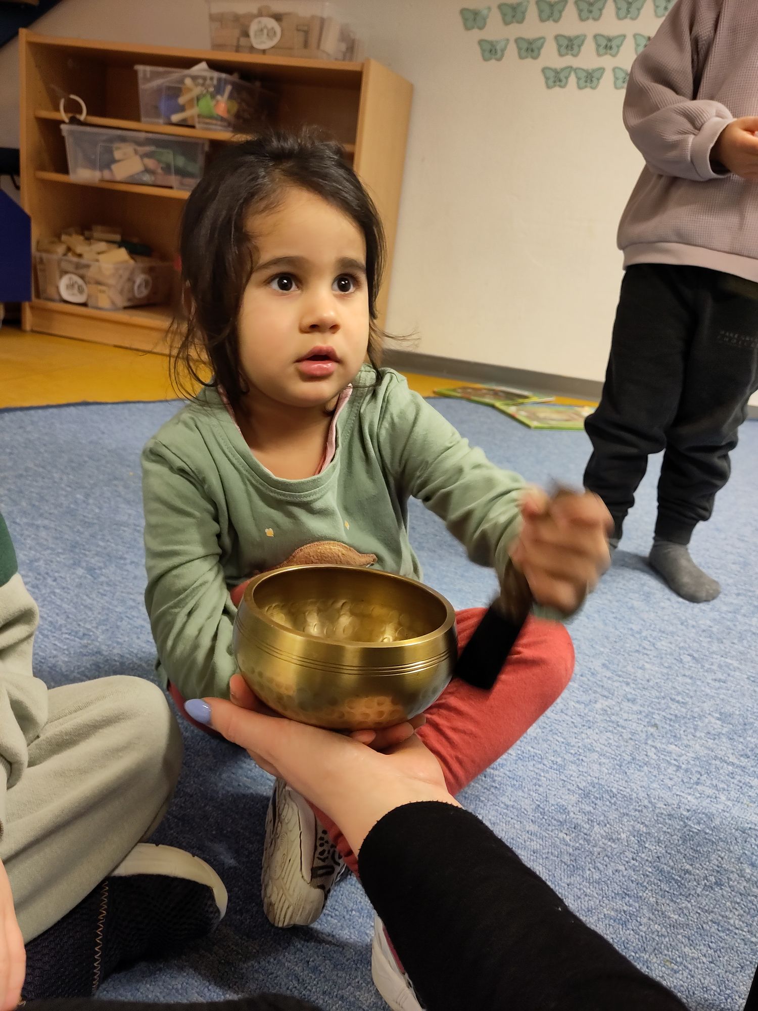 Diese haben die Kinder erst einmal genau unter die Lupe genommen. Nicht nur der erzeugte Ton der Klangschale begeisterte die Kinder, sondern auch das Gefühl von Vibration auf der Hand war faszinierend. Ein dazu passendes Angebot durfte natürlich nicht fehlen. Bei einer Traumreise kam die Klangschale ebenfalls zum Einsatz und begeisterte die Kinder.