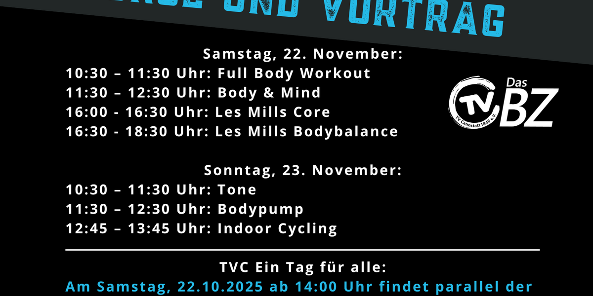 Parallel zum Aktionstag „Ein Tag für ALLE“ lädt das Bewegungszentrum (BZ) des TV Cannstatt am 22. und 23. November 2025 jeweils von 10:00 bis 18:00 Uhr zu den Tagen der offenen Tür ein.