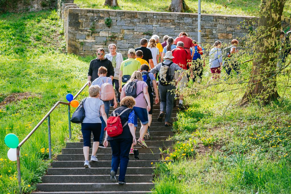 Auf der ausgeschilderten „StäffelesWalk“-Strecke starteten verschiedene Leistungsgruppen: Eine Running-Gruppe für alle ambitionierten Läuferinnen und Läufer und mehrere Walkinggruppen für zügige, durchschnittlich schnelle und gemütliche Walkerinnen und Walker. Alle Teilnehmer, denen die neun Kilometer der „StäffelesWalk“-Strecke zu lang waren, konnten stattdessen einen Spazierrundgang mit fünf Kilometern Länge in Angriff nehmen. Highlights der Strecke 2018 waren die malerischen Blicke auf das Neckartal und die Ruine Engelburg im Stadtbezirk Mühlhausen. Der „Run up“ bot eine Streckenführung ohne Stäffele und startete ebenfalls beim TVC. Geführt wurden alle Run up & AOK-StäffelesWalk-Gruppen von erfahrenen Walking- und Lauftreffleitern.