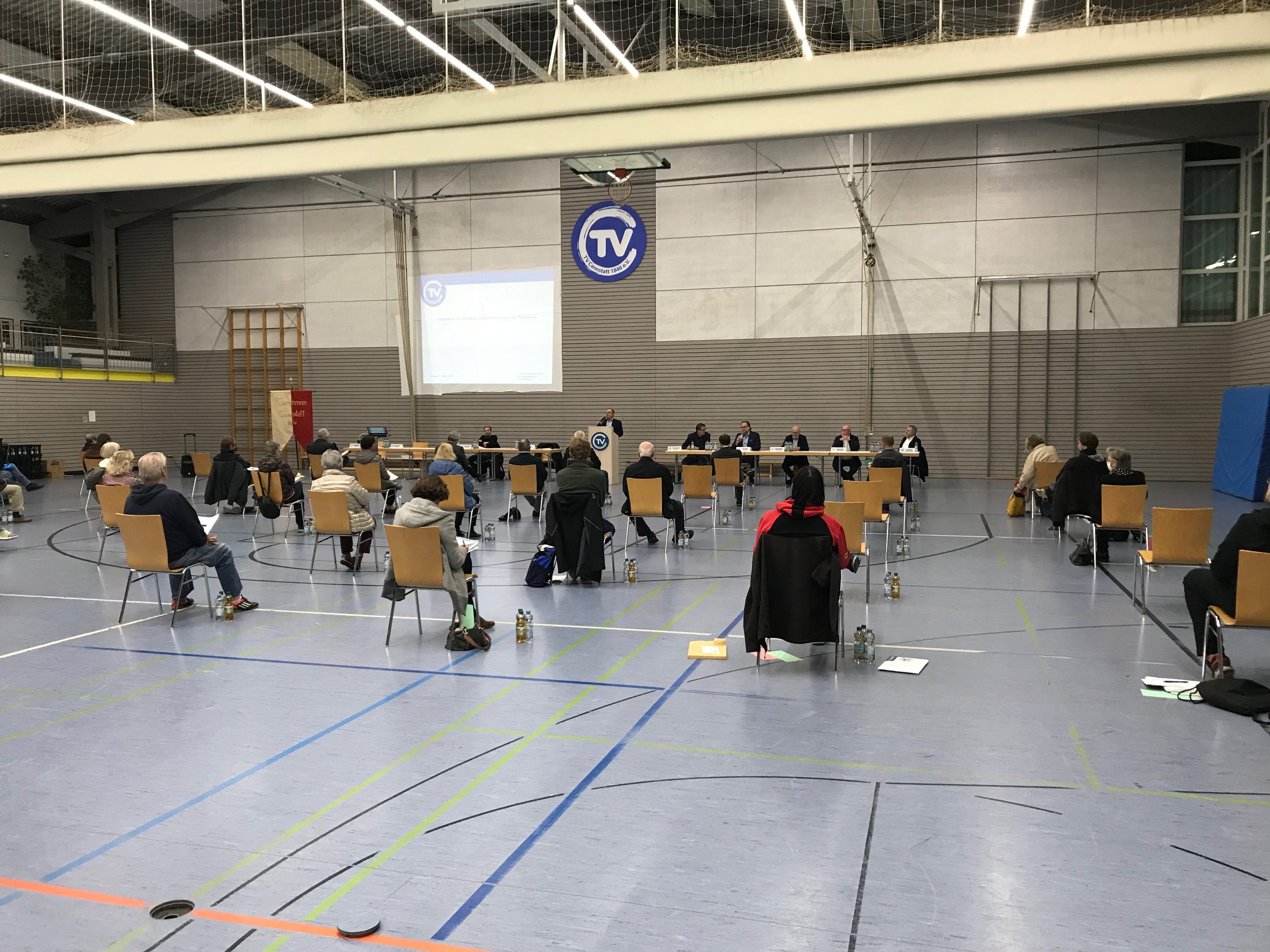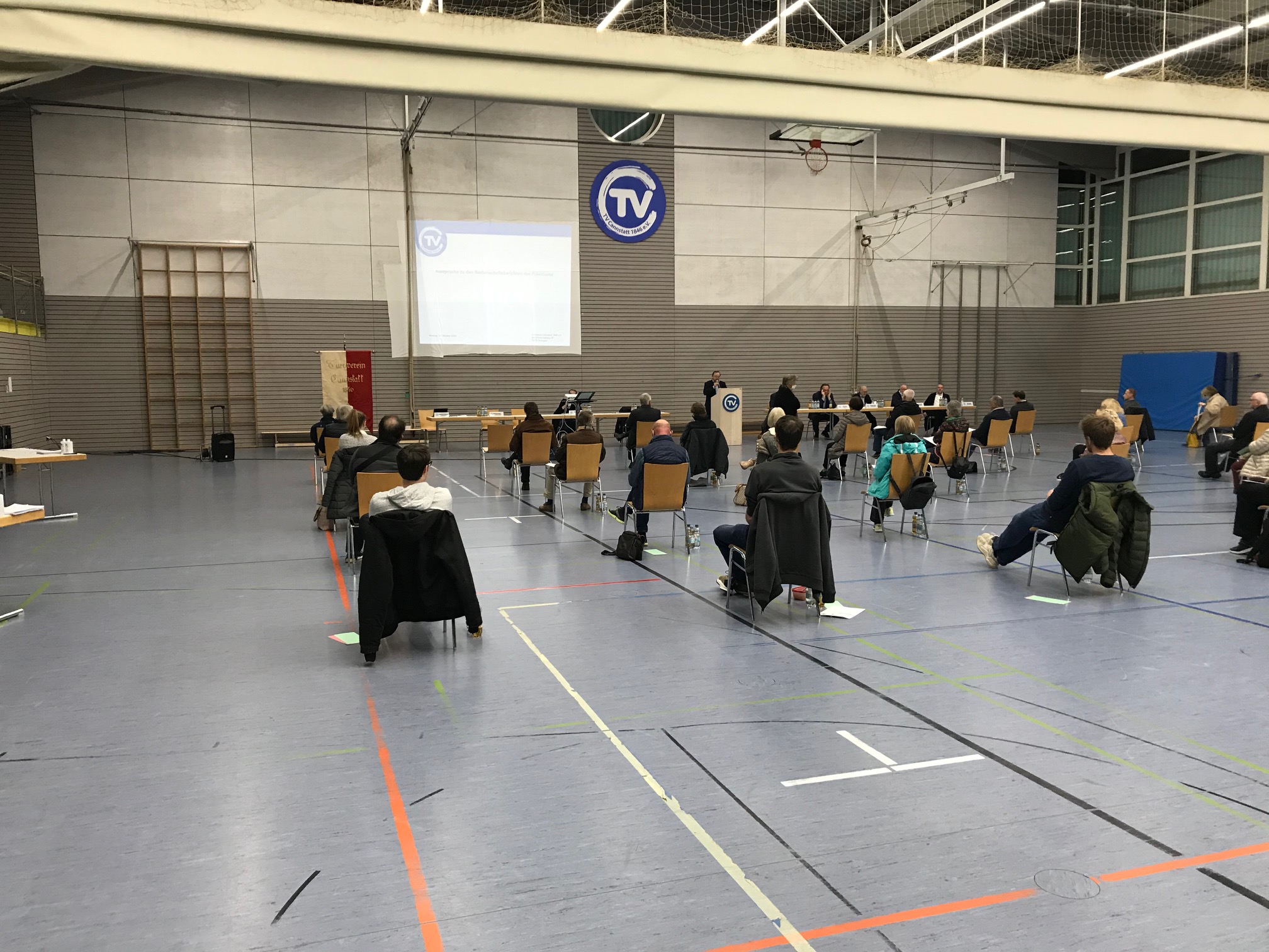 Unter strengsten Hygienevorschriften tagte die Vertreterversammlung der 22 Abteilungen des Turnverein Cannstatt und fasste weitreichende Beschlüsse. Erstmals fand die Versammlung in der großen vereinseigenen Sporthalle statt, um den notwendigen Abstand von zwei Meter zwischen den Teilnehmern einhalten zu können. Auch wurde während der gesamten Versammlung die Sporthalle gelüftet.
