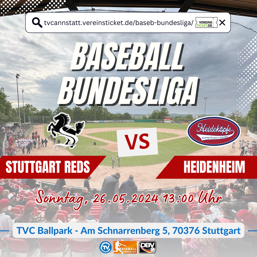 Erlebe mitreißenden Baseball in unserem familiären, 650 Zuschauer fassenden Stadion! Die Stuttgart Reds treffen auf die Heidenheim Heideköpfe und hoffen auf ein packendes Match.