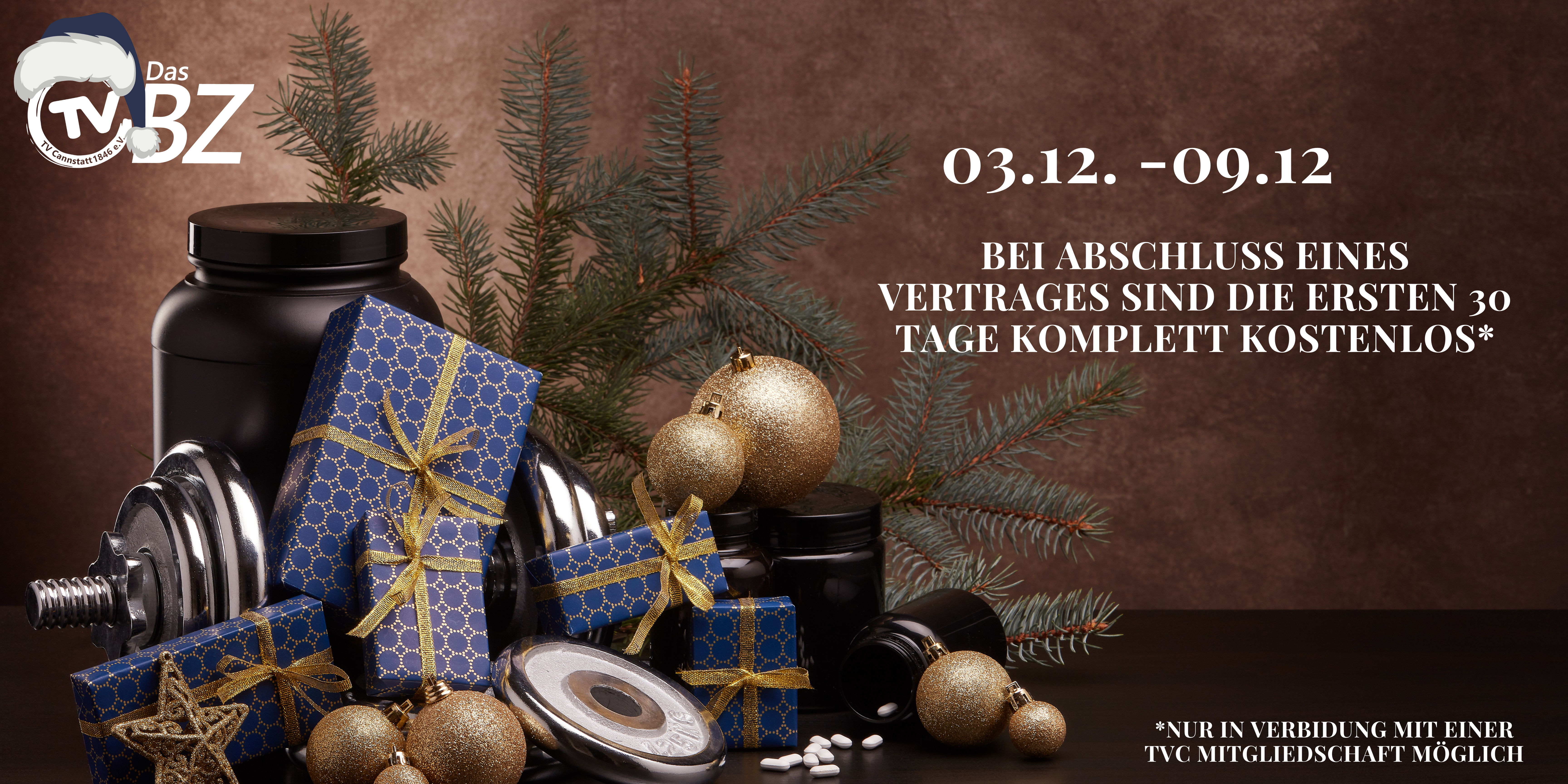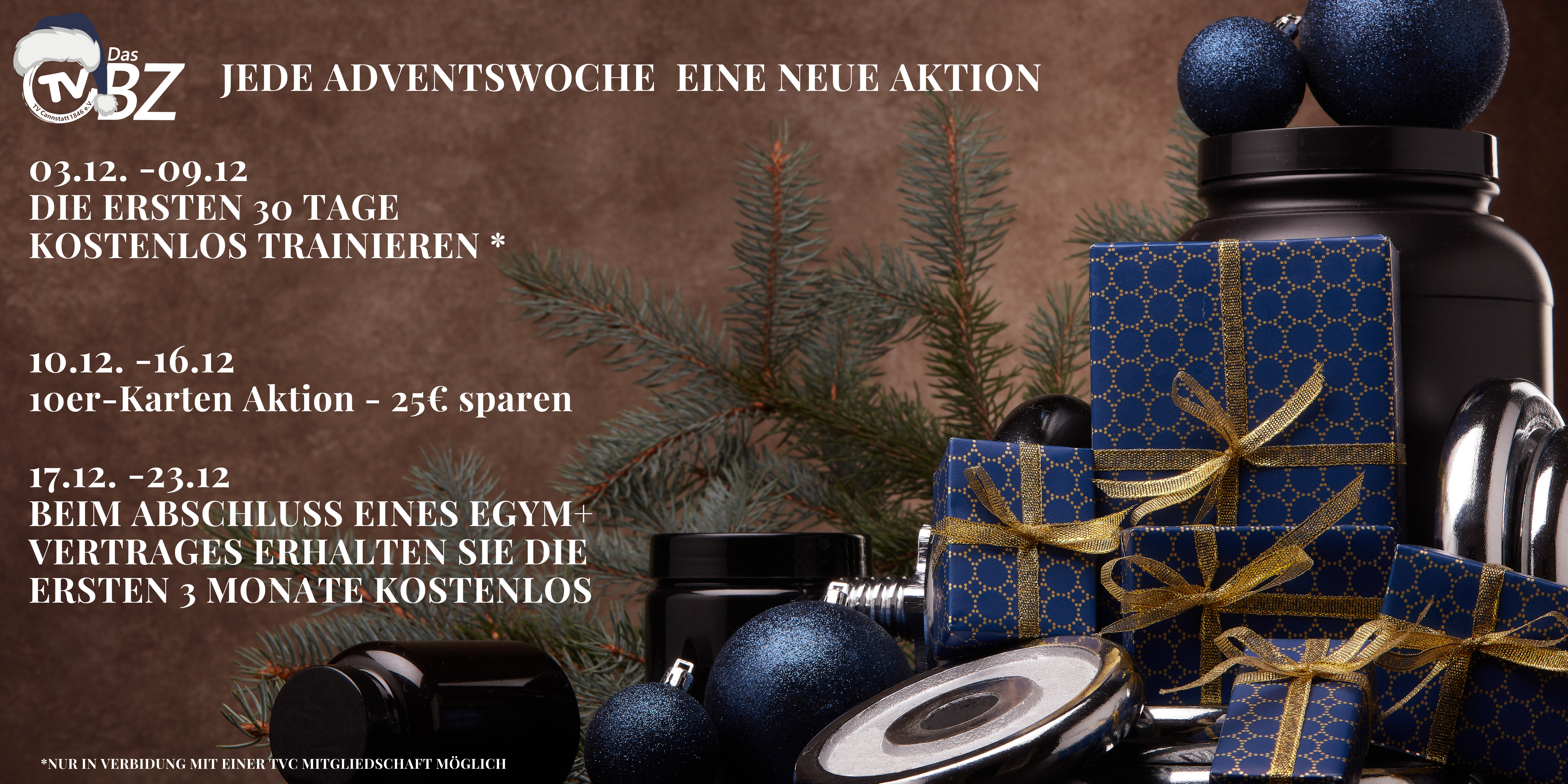 Starte in die Adventszeit mit Schwung! Bei Abschluss eines Vertrages in dieser Woche sind die ersten 30 Tage komplett kostenlos*. Eine fantastische Möglichkeit, unser Angebot unverbindlich kennenzulernen. *Nur in Verbindung mit einer tvc Mitgliedschaft möglich.