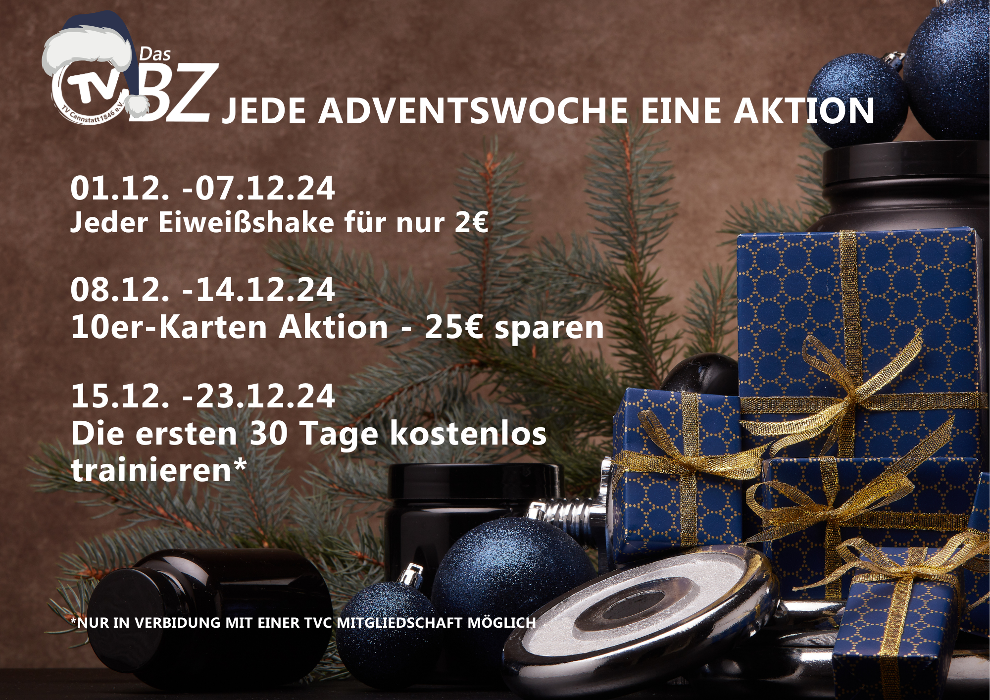 3. Adventswoche: 30 Tage kostenloses Training für Neuanmeldungen (15.12. - 23.12.2024) Noch kein Mitglied? Dann haben wir das perfekte Weihnachtsgeschenk für dich! Vom 15.12. bis zum 23.12.2024 können sich alle Neuanmeldungen im Bewegungszentrum auf ein tolles Angebot freuen: Die ersten 30 Tage trainiert ihr kostenlos! Dieses Angebot gilt in Verbindung mit einer Mitgliedschaft im TVC und ist die beste Gelegenheit, ins Training einzusteigen und das neue Jahr von Anfang an fit und gesund zu beginnen.