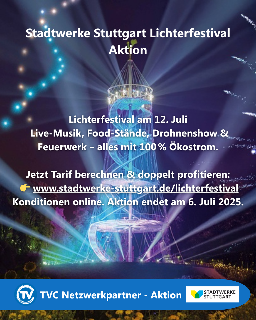Unser Netzwerkpartner Stadtwerke Stuttgart lädt am 12. Juli 2025 zum großen Lichterfestival im Höhenpark Killesberg ein – mit Live-Musik auf vier Bühnen, kulinarischer Vielfalt und einer eindrucksvollen Licht-, Drohnen- und Feuerwerkshow.