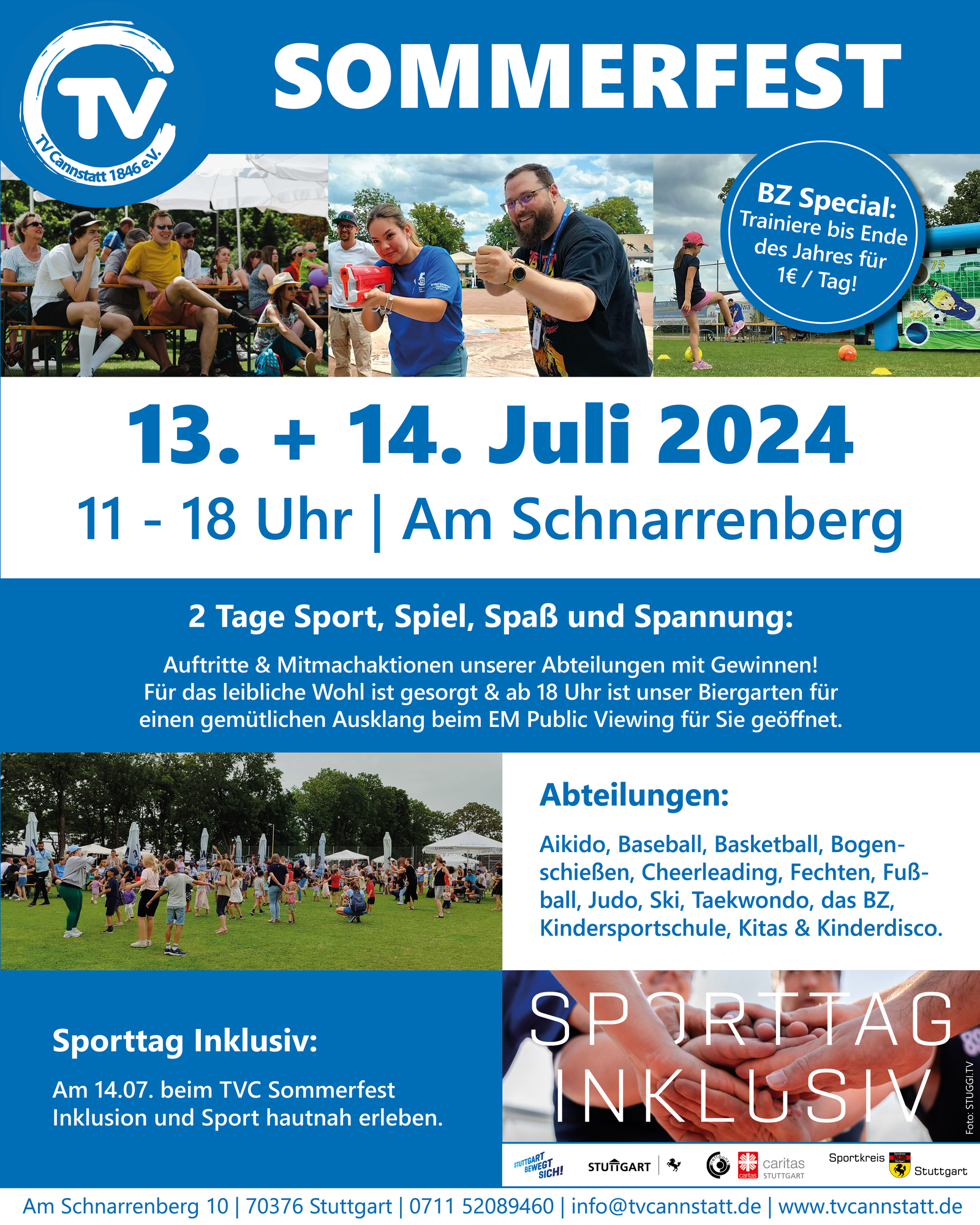 Wir laden alle herzlich zu unserem diesjährigen TV Cannstatt Sommerfest ein! Erlebt zwei Tage voller Sport, Spiel, Spaß und spannender Aktivitäten. Unser Sommerfest bietet eine großartige Gelegenheit, unsere Gemeinschaft zu stärken und neue Leute kennenzulernen.