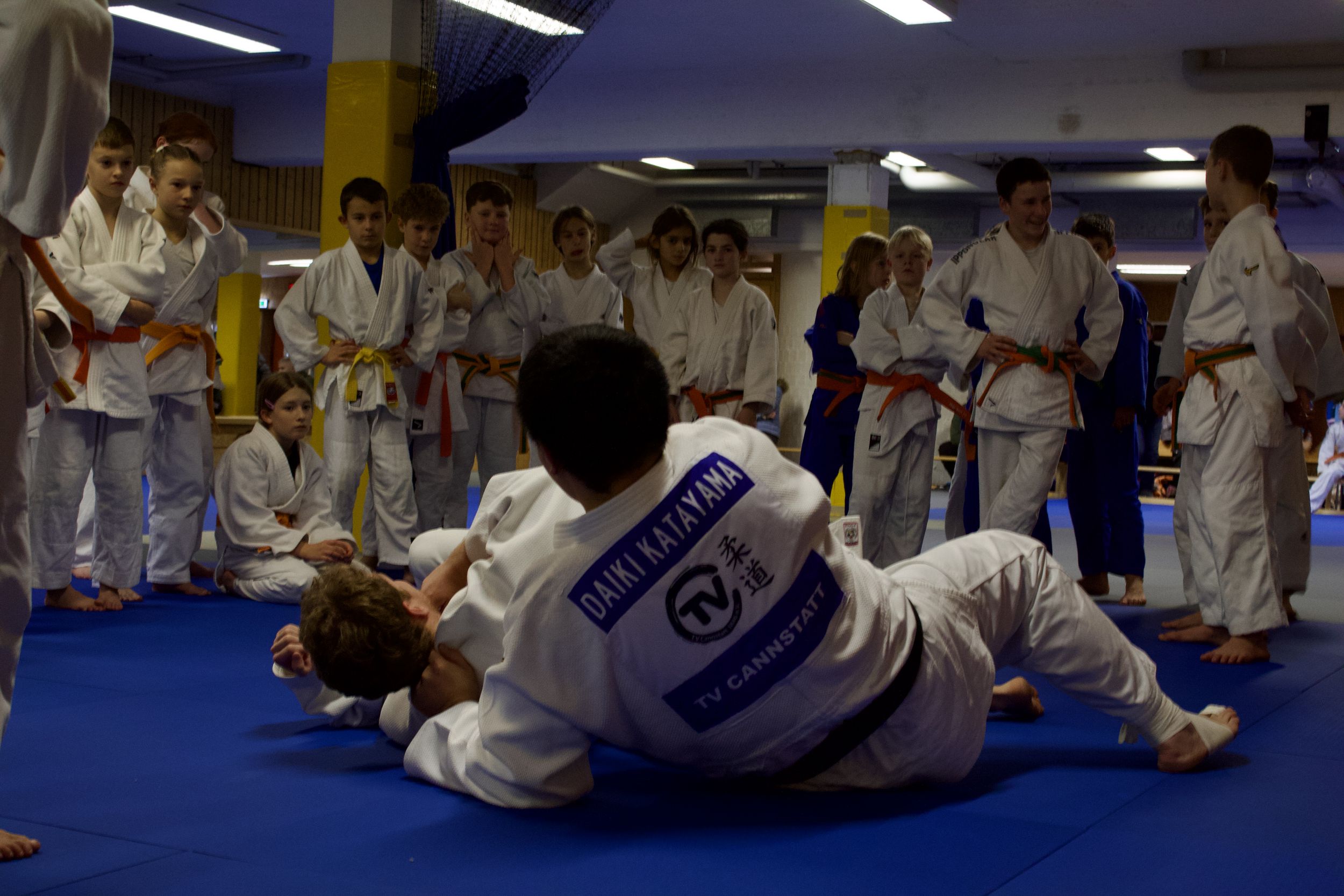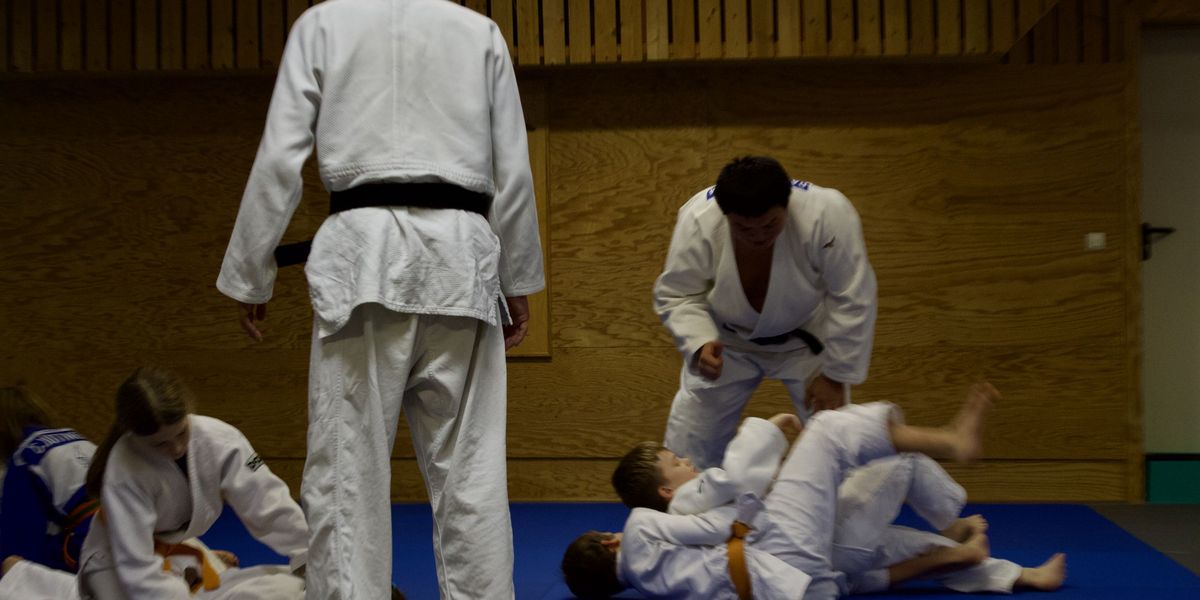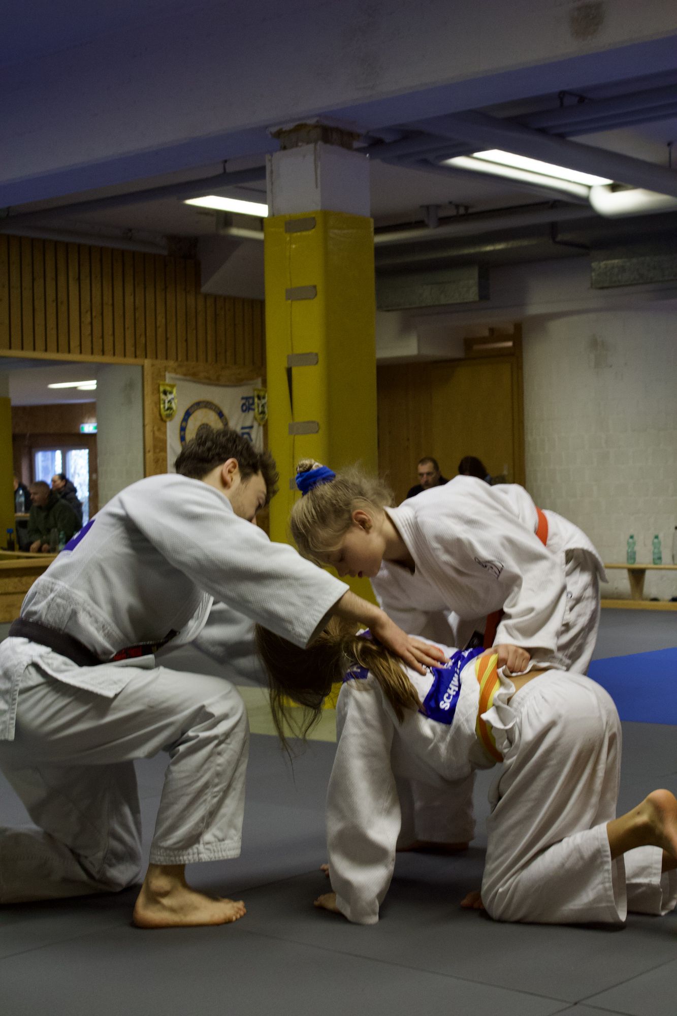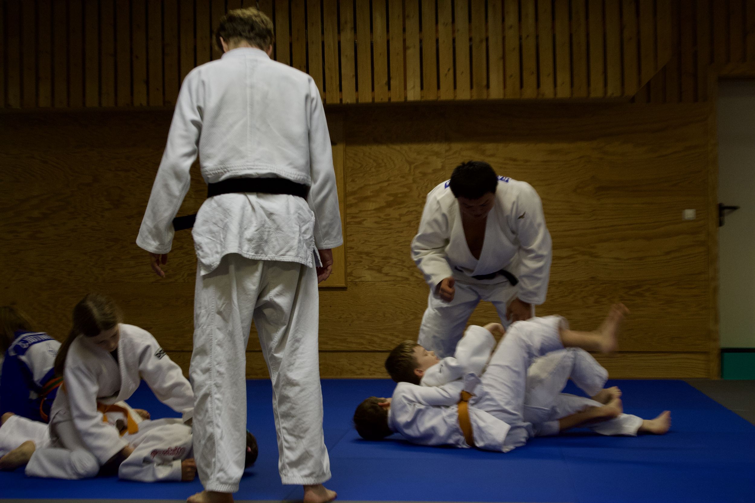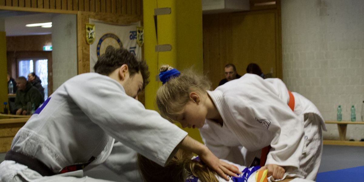 Die beiden Coaches aus den Gewichtsklassen bis 60 kg bzw. über 100 kg nutzten ihre unterschiedlichen körperlichen Voraussetzungen, um den Kindern jeweils zwei verschiedene Techniken im Boden- und Standkampf zu vermitteln.