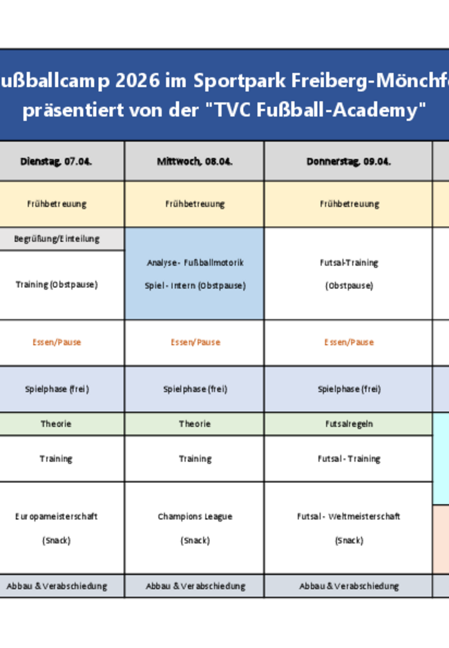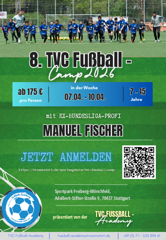Wir freuen uns ihr Kind bei unseren "Camps", präsentiert von der „TVC Fußball-Academy“, begrüßen zu dürfen. Ihr zweifelt noch euer Kind anzumelden? Dann sieht unbedingt die weiteren Details an gleich unten, in dem IHR auf "mehr" klickt. Und vergisst nicht, runter zu "scrollen". Darunter findet Ihr auch den Kontakt für evtl. offene Fragen.