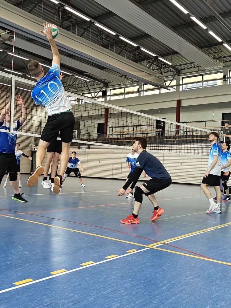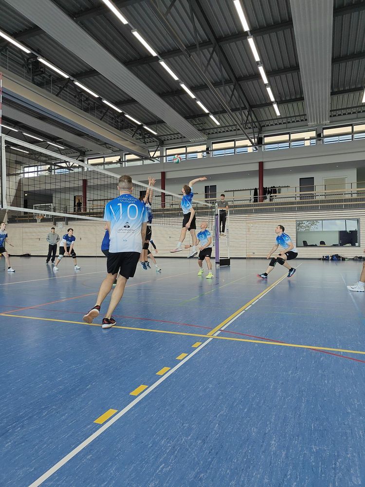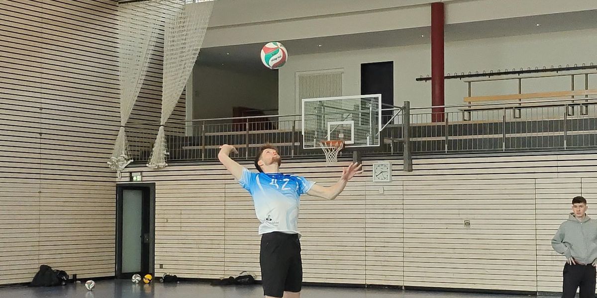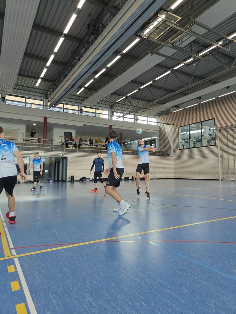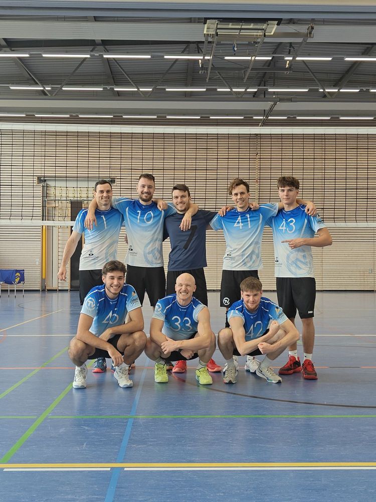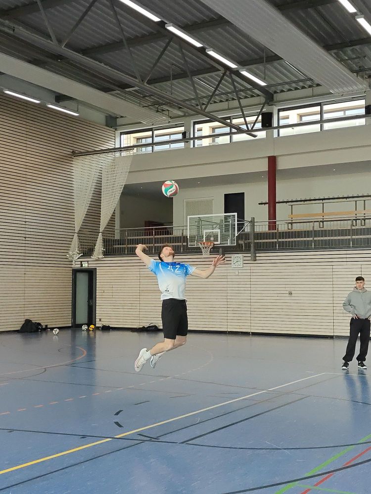 Zum zweiten Satz durfte sich nun auch der dritte Neuzugang Flo auf Außen profilieren. Auch mit allen drei Neuen auf dem Feld funktionierte die Mannschaft wie ein Schweizer Uhrwerk. So konnten einige feine Spielzüge aufs Parkett gezaubert werden. Nach lässiger Annahme im Halbfeld nahm Tom maß für den „Hit des Tages“ und donnerte den Ball unbarmherzig in den Dreimeterraum. Auch Capitano Martin, selbsternannter MVP des Universums, packte seine weltbekannte linke Pranke aus – und drosch den Ball in einem Winkel, den selbst Pythagoras nicht berechnet hätte, auf den Boden. So sammelten sich schnell 23 Punkte auf dem Scoreboard. Nach schlechtem ersten Aufschlag entschied sich unser Interim-Coach Marit für die letzten zwei Aufschläge den eigentlichen Spielertrainer Mateus die Höchststrafe zu verpassen und wechselte ihn für Nik aus. Dieser fasste sich ein Herz und anscheinend auch Inspiration beim Spielertrainer – der Aufschlag: Bodenlos und im Netz. Das reichte aber nicht, um uns selbst ein Bein zu stellen. Kurz danach war auch der zweite Spielabschnitt in der Tüte.
